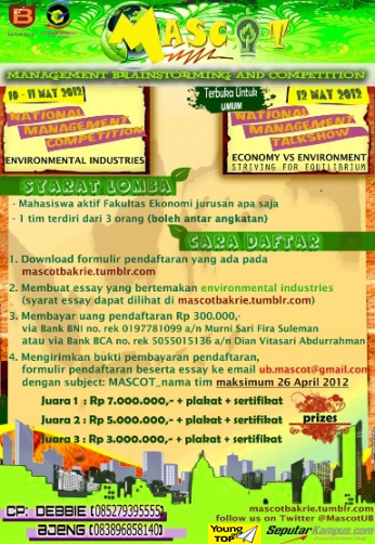 Deadline: 26 April 2012 Mascot merupakan acara inti yang terdiri dari 2 sub acara, yaituManagement Brainstorming (Talkshow) dan National ManagementCompetition. Rangkaian acara Mascot dimulai dari tanggal 10 hingga 12Mei 2012. National Management Competition akan diadakan pada hari pertama dan kedua (10 dan 11 Mei), sedangkan Management Brainstormingakan diadakan pada tanggal 12 Mei 2012. Adapun hadiah yang diberikan pada National Management Competition: Juara 1: Rp 7.000.000 + plakat + sertifikat Juara 2: Rp 5.000.000 + plakat + sertifikat Juara 3: Rp 3.000.000 + plakat + sertifikat Baca selengkapnya » | ||